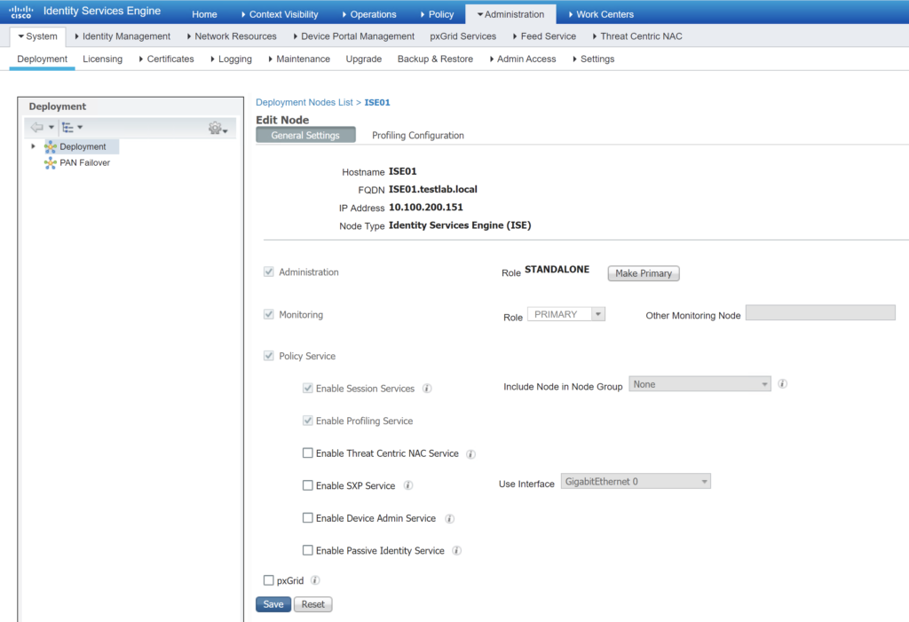 With a standalone deployment ISE handles functions like Administration, Monitoring and Policy Services. For redundancy purpose you can add another ISE node to your deployment to let it take over in case the primary node fails. We have ISE01 in standalone mode and we’ve installed ISE02 as an empty node in standalone mode as wel. Let’s refer to ISE01 as the Primary and ISE02 as the Secondary.